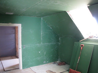 As you can see from some of these photos we have also started putting up the sheet-rock and the shape of the rooms are coming together. Don't worry the green isn't staying. The sheet rock is mold resistant and comes in this green color. Plastering in a weeks time we hope.